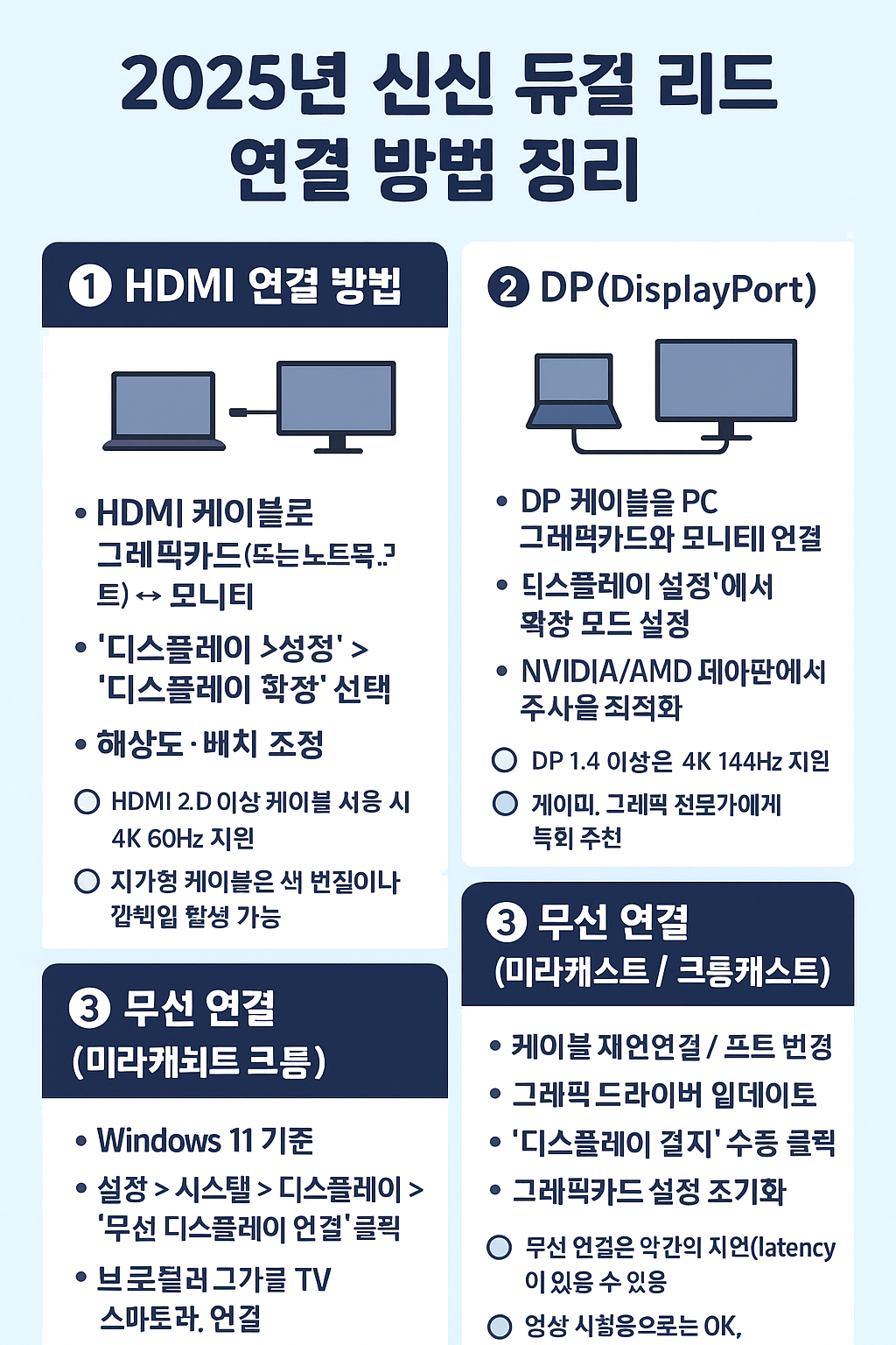 “노트북에 모니터 하나만 더 연결해도 업무 효율이 2배!”요즘 재택근무, 인강, 영상편집, 주식 트레이딩 등으로 듀얼 모니터 수요가 급증하고 있습니다.하지만 연결했는데 화면이 안 뜨거나, 인식이 안 되는 문제를 겪는 분들도 많죠.이 글에서 HDMI, DP, 무선 연결 방법부터 인식 오류 해결법까지 단계별로 정리했습니다.🧩 1. 노트북 듀얼 모니터 연결 기본 원리듀얼 모니터는 하나의 노트북 화면을 확장하거나 복제해서두 개의 화면을 동시에 사용하는 기능입니다.✅ 확장 모드: 각 화면에 다른 프로그램 표시✅ 복제 모드: 두 화면이 동일하게 표시👉 Windows 기준:Win + P → 확장 / 복제 / 하나만 표시 중 선택⚙️ 2. HDMI로 듀얼 모니터 연결하는 방법가장 쉬운 방법은 HDMI 케이블을 이용..